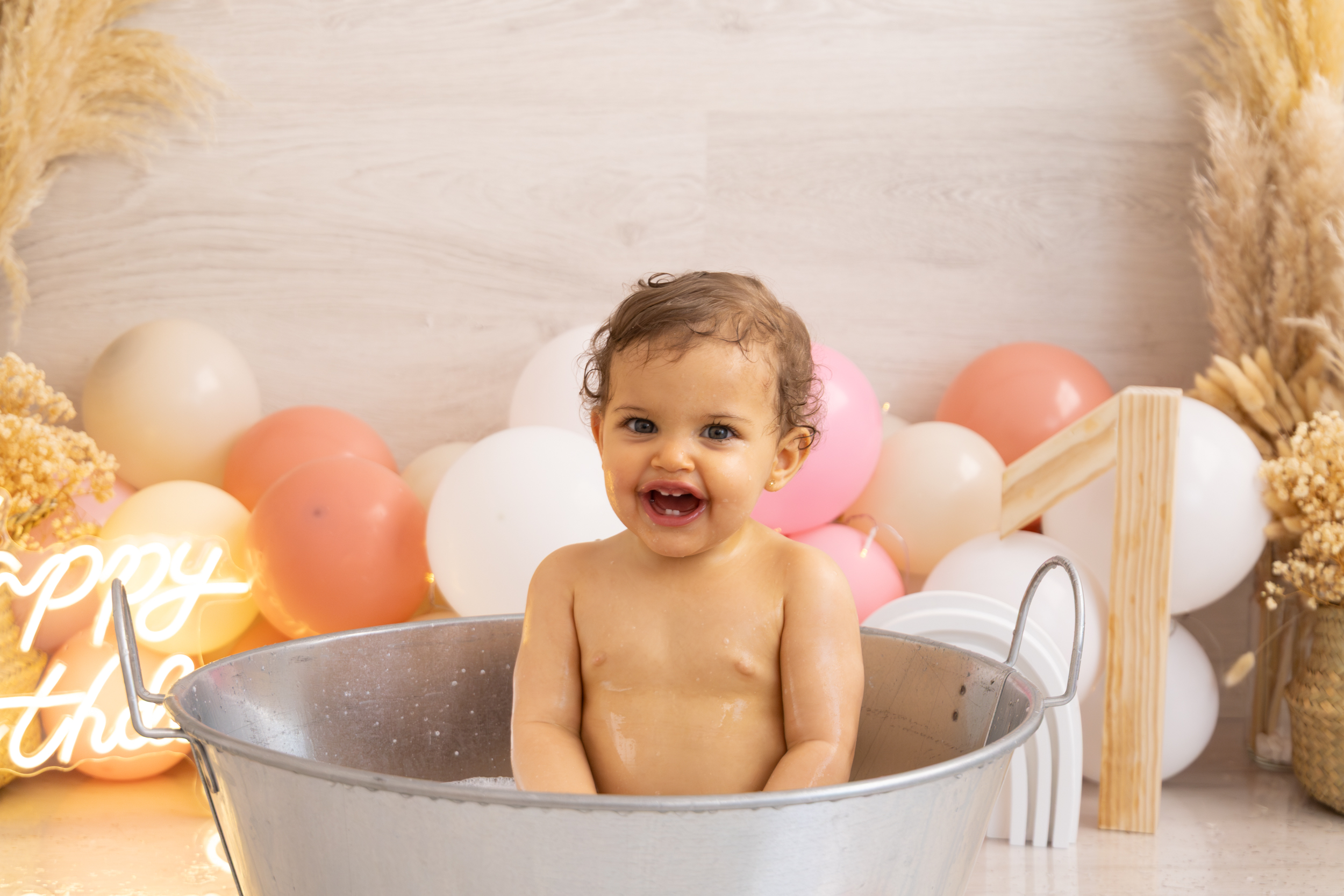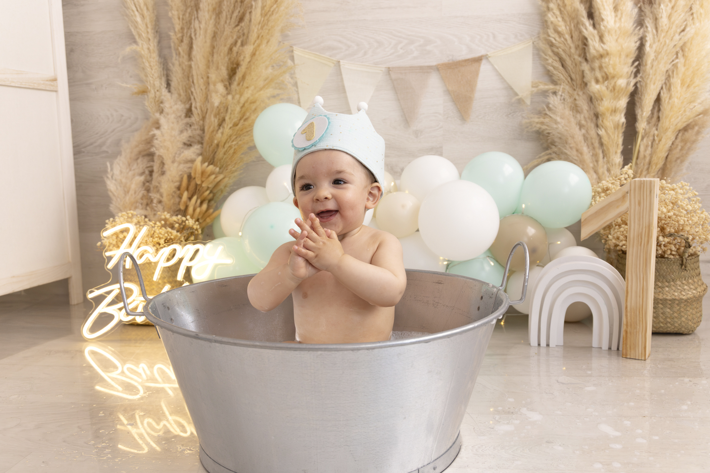 Haz que la sesión Smash Cake sea aún más especial añadiendo un divertido baño de espuma al final. Muchos peques no disfrutan del todo la textura de la tarta o no les gusta mancharse, y eso puede hacer que no se diviertan como nos gustaría. Sin embargo, la sesión del baño siempre triunfa: les encanta el agua, juegan, se relajan y nos regalan sonrisas irresistibles.