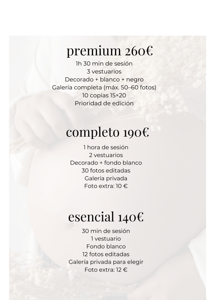 El mejor momento para reservar las sesiones de embarazo es a principios del tercer trimestre de embarazo para poder garantizar disponibilidad.
